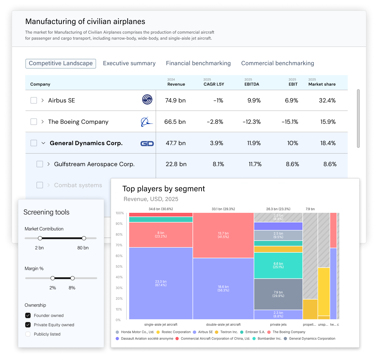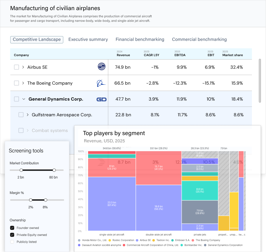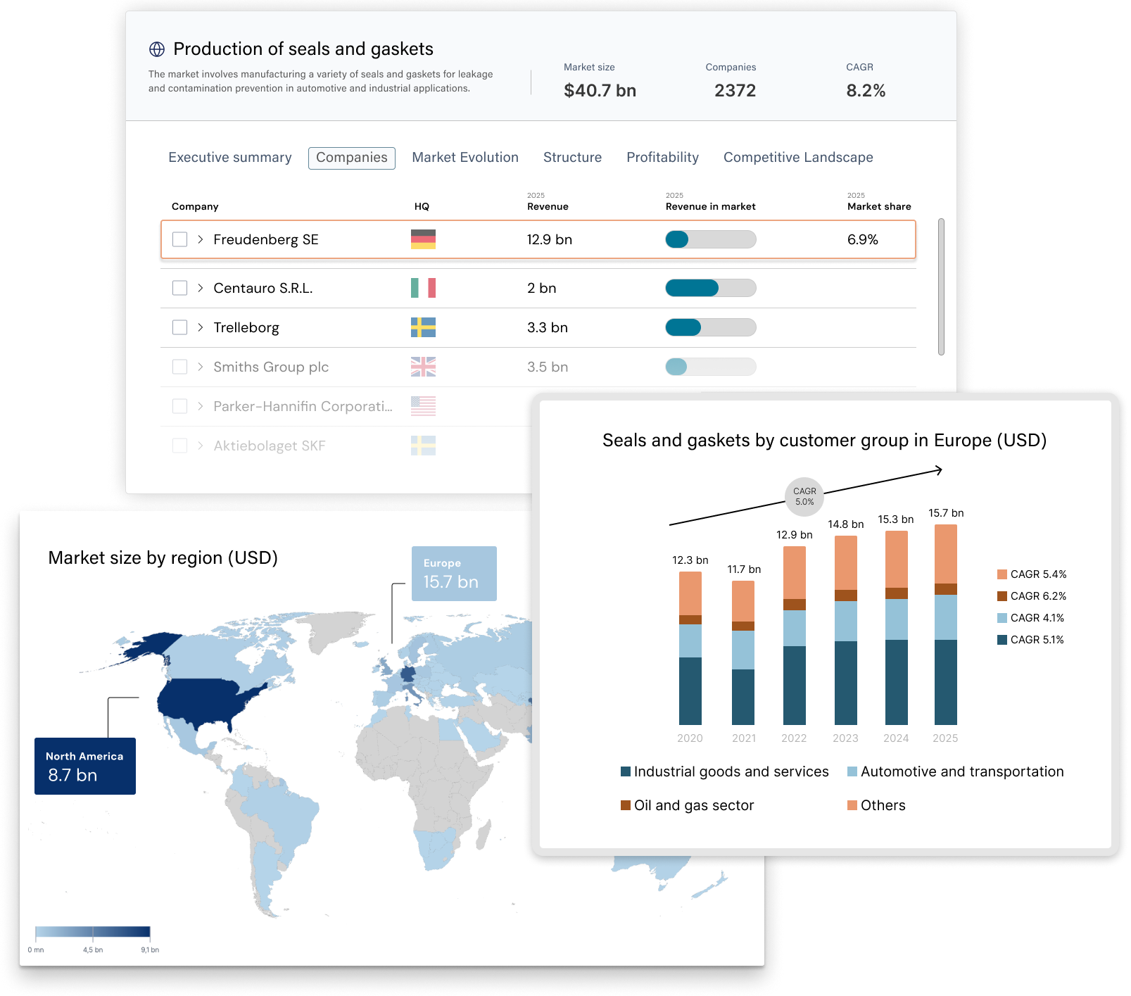 The platform enables flexible segmentation by product, geography, customer type, value chain position, and business model, so you can explore not just overall size but the most relevant sub-markets for your strategy.